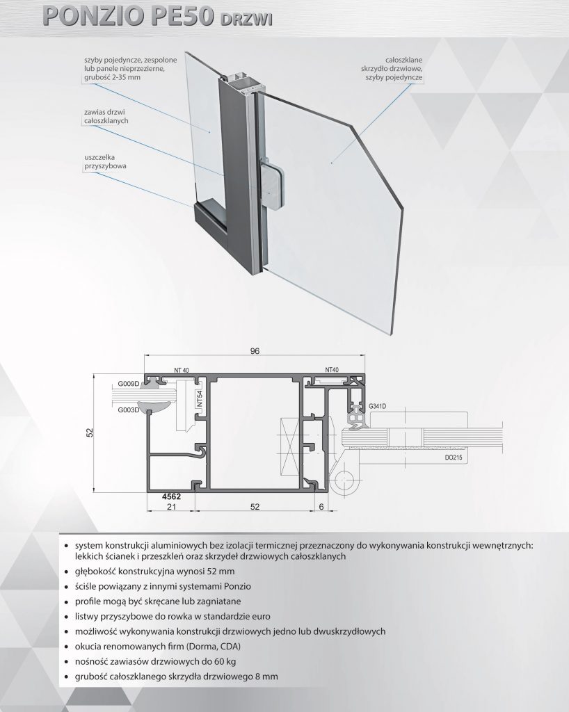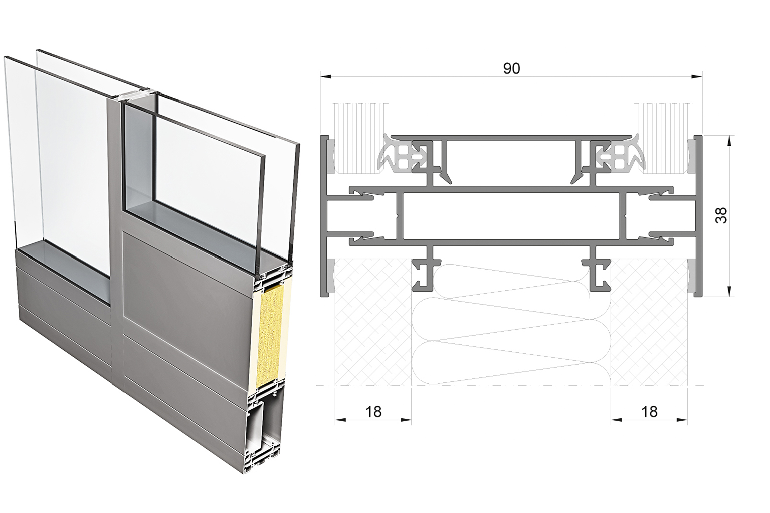 – wypełnienia: szkło lub panele nieprzezierne o grubości od 3 do 18 mm (montaż za pomocą listew dociskowych i odpowiednio dobranego kompletu uszczelek przyszybowych)