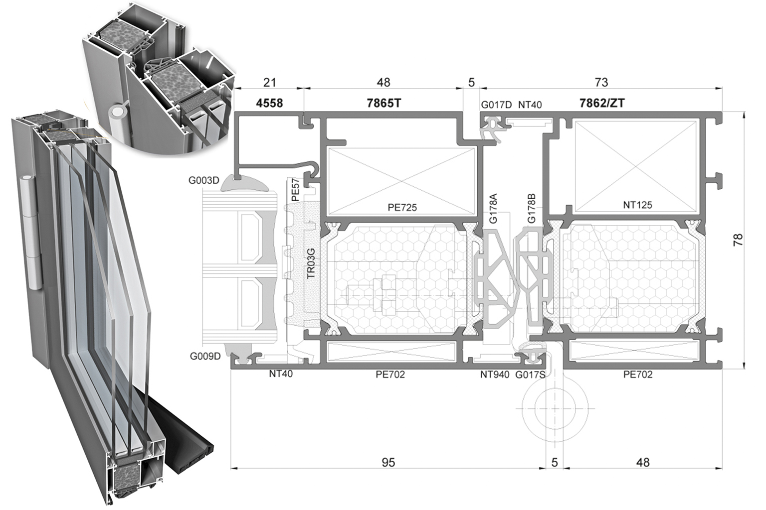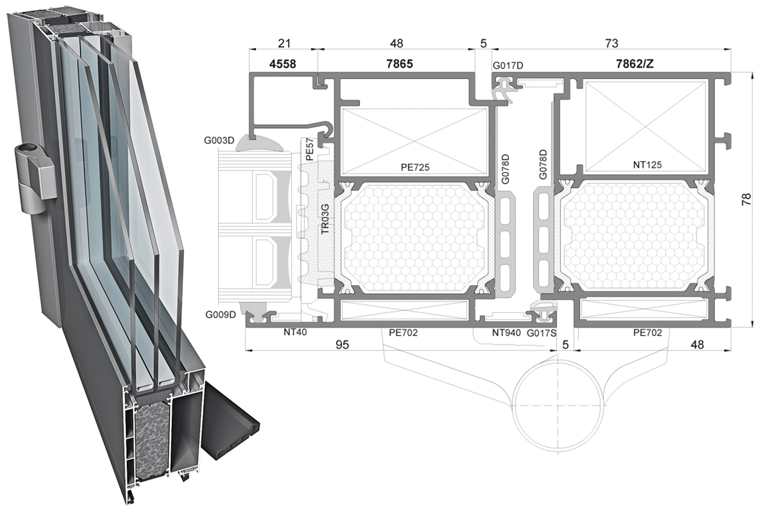 – różne warianty izolacyjności termicznej, w zależności od zastosowanych wkładów izolacyjnych: PE78N+, PE78NHI, PE78NHI+