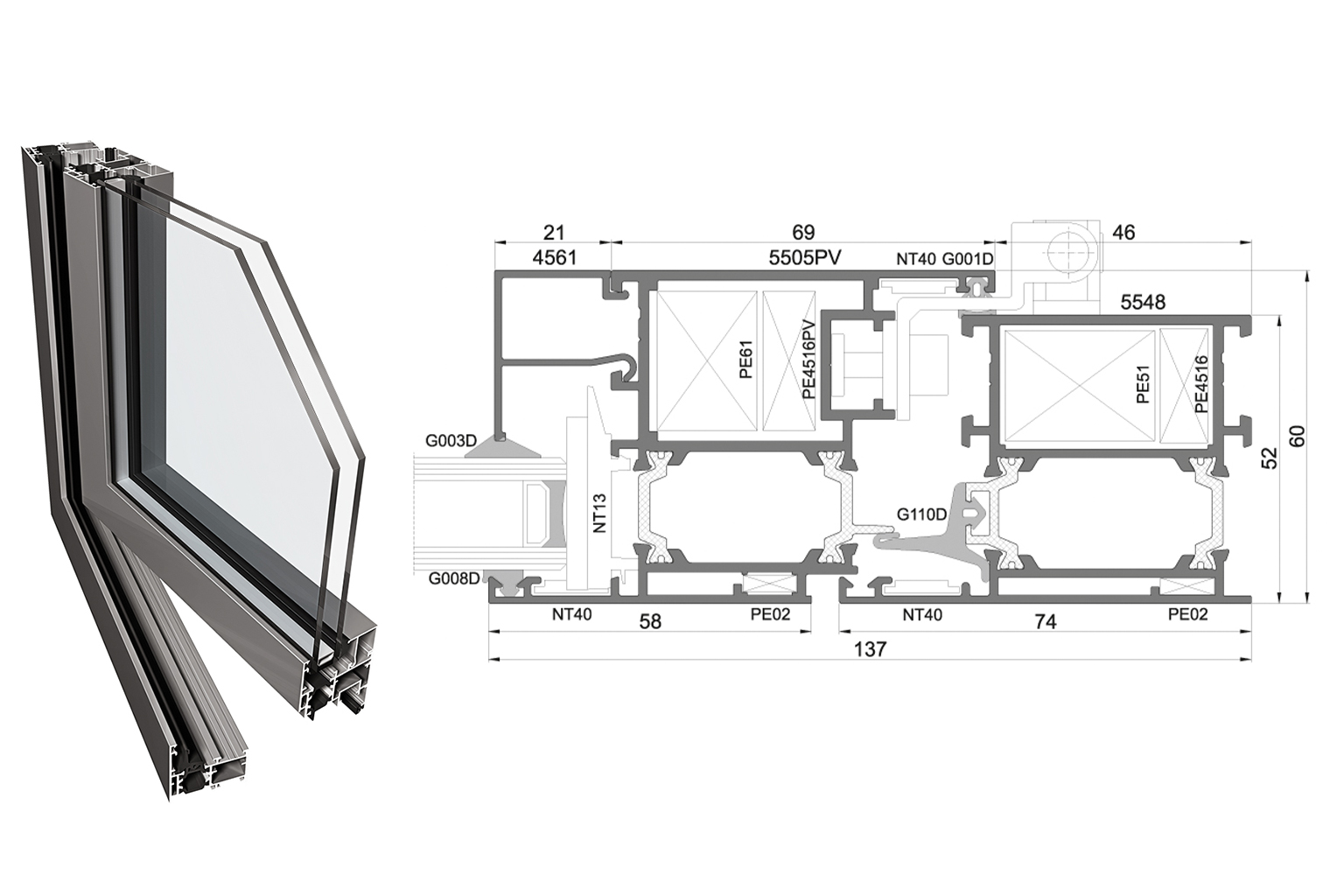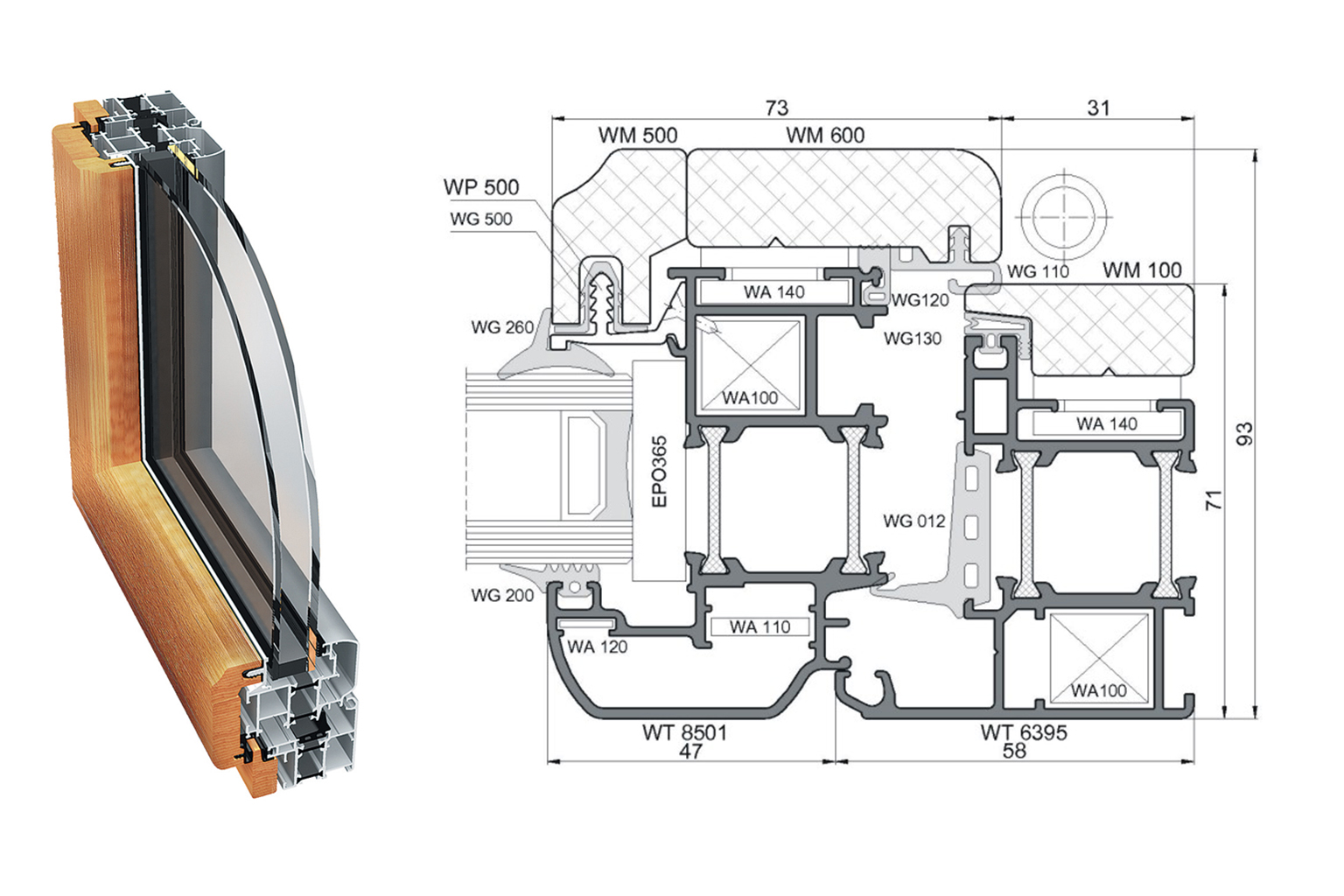 System okienno-drzwiowy jest połączeniem aluminium i drewna, jego główną cechą jest zastosowanie przekładki termicznej o szerokości 24 mm. Głębokość konstrukcyjna kształtowników dla ościeżnic i skrzydeł zwiększyła się do 70 – 93 mm, dzięki temu poprawiła się również izolacyjność termiczna systemu.