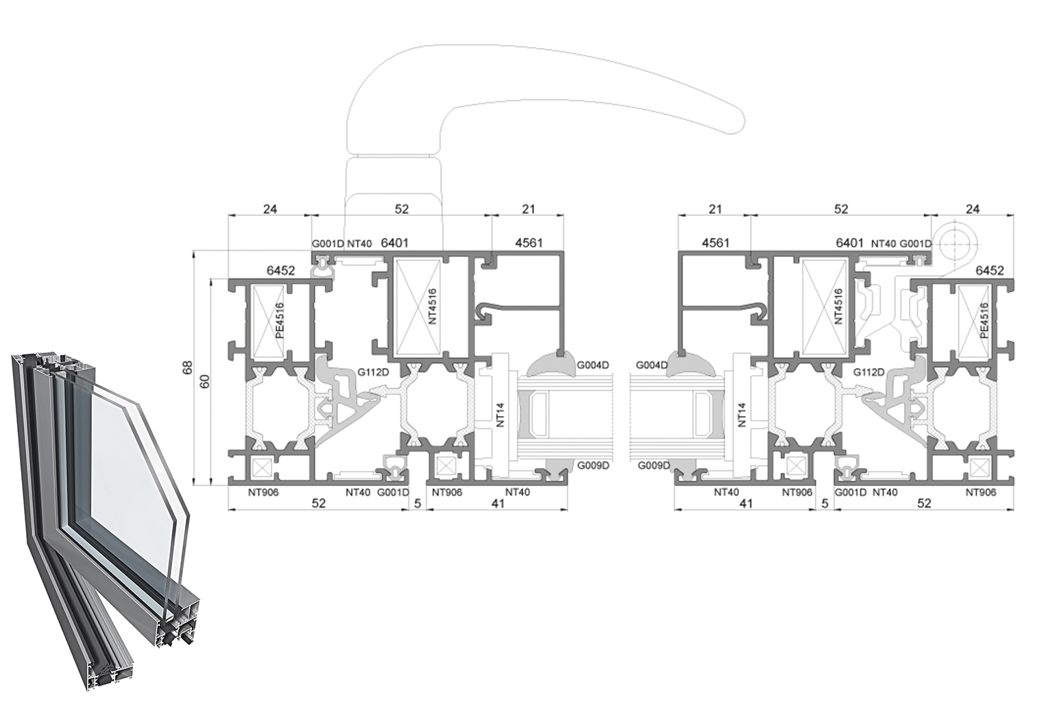 Wariant sytemu PE68 o trzykomorowej konstrukcji profili z rowkiem okuciowym w standardzie Euro oraz rowkiem okuciowym stosowanym w oknach i drzwiach balkonowych z profili PVC lub drewnianych.