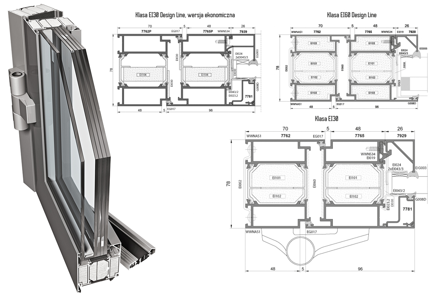 ościeżnicy i skrzydła – 78 mm (dla ramy EI120 – 89 mm)