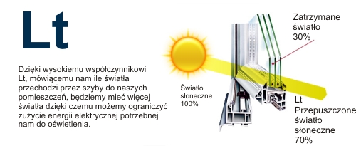 Współczynnik przepuszczalności światła, to parametr pokazujący, jaka część światła widzialnego, padająca pod kątem bliskim 90o przepuszczana jest przez szkło. Współczynnik przepuszczalności światła „Lt” podawany jest zawsze, jako wartość %. Im wyższa jest % wartość współczynnika przepuszczalności światła, tym więcej światła przenika przez szybę do wnętrza pomieszczenia.